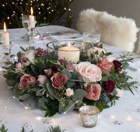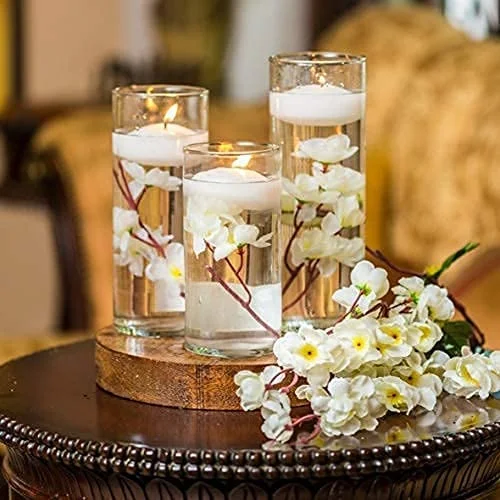 Si buscas crear una atmósfera romántica y acogedora, coloca velas flotantes en recipientes de cristal con pétalos de rosa. Esta opción es ideal para bodas nocturnas, y el reflejo de las velas en el agua crea una estética mágica.