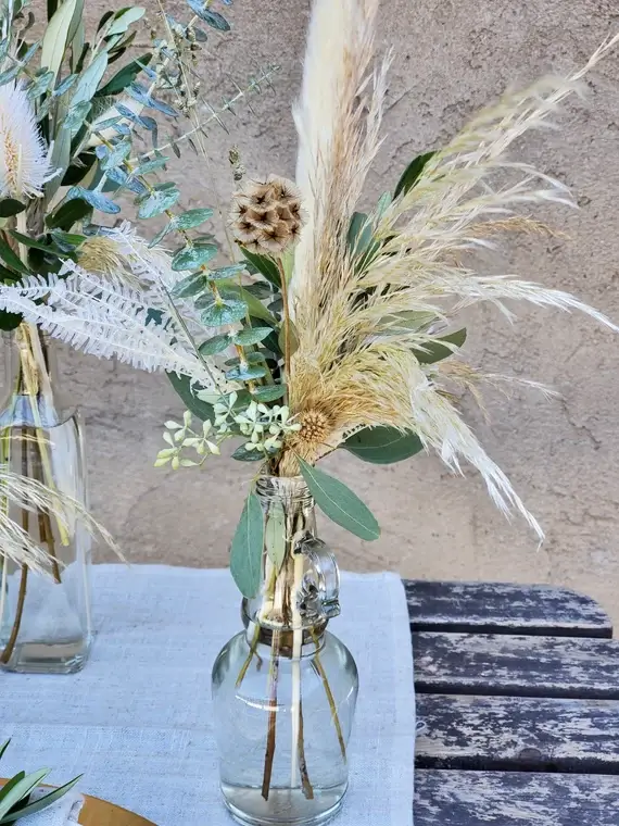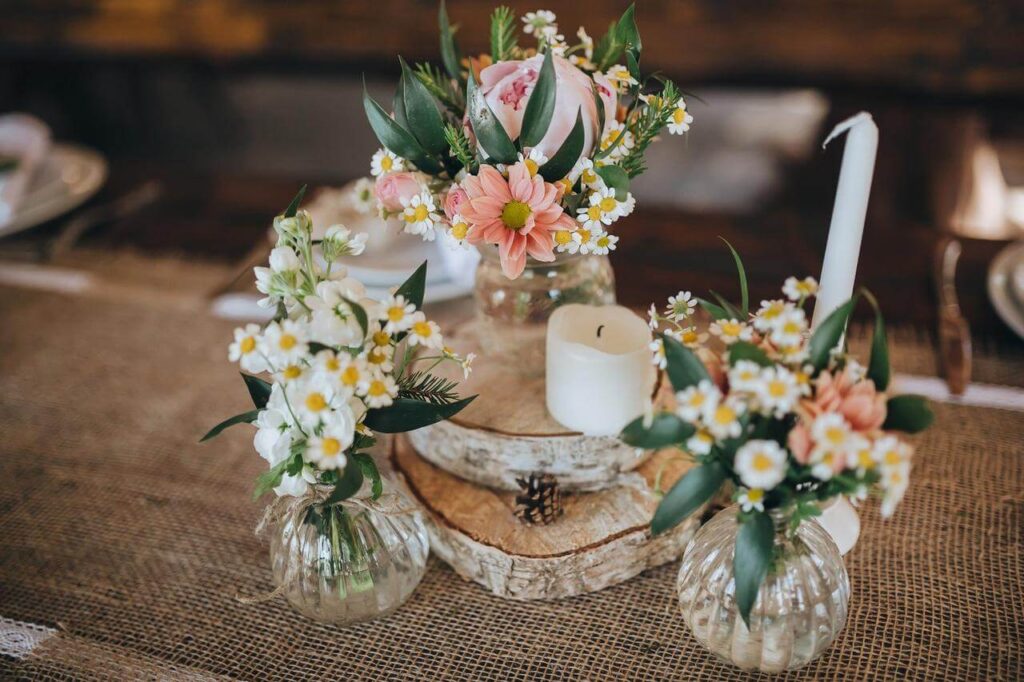 Usar jarras o botellas recicladas como floreros es una opción original y sostenible. Llénalas de flores silvestres para un look rústico que encantará a tus invitados. Este estilo funciona especialmente bien en bodas campestres o en jardines.
