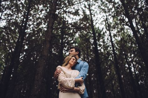 Una pose cálida y romántica. Uno abraza por la espalda al otro, mientras ambos miran al horizonte o cierran los ojos. Refleja protección y ternura.